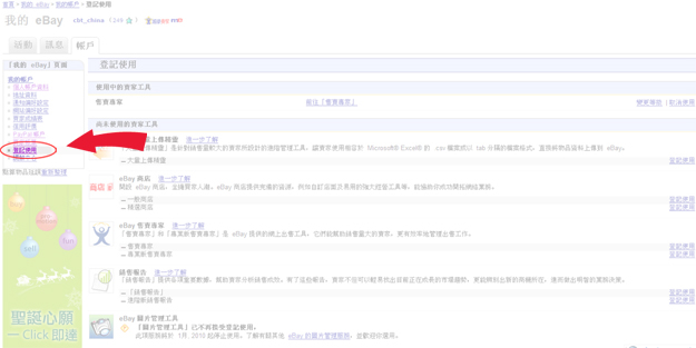 登记使用eBay商店操作演示:方式一:首先登录“我的eBay”,在左侧导航栏“我的帐户”下点击“登记使用”,选择是登记“一般商店”或者“精选商店”;